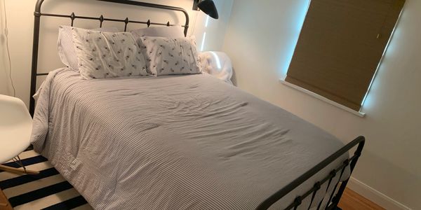 The farmhouse has 4 bedrooms, each with a full bed that sleeps two. A fifth bed folds out of the couch in the family room with the wood stove.
